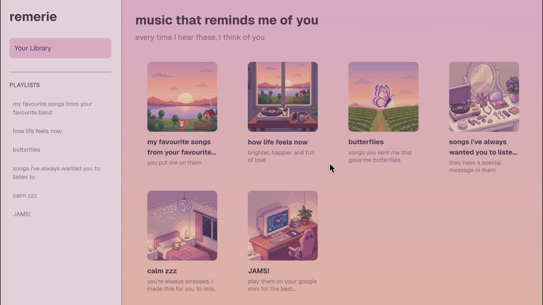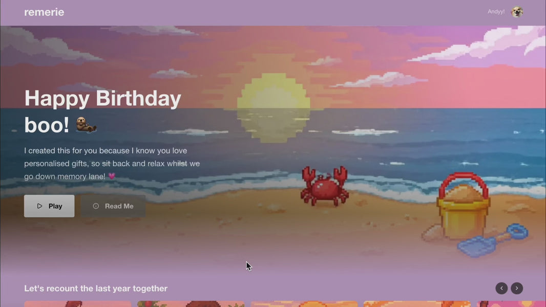 Remerie is a platform where you can create personalised digital cards filled with music, photos, and heartfelt messages. Each one is like a little digital memory capsule, designed to capture emotions and share something special with the people who matter most. It’s a unique and thoughtful online gift that’s sure to make anyone smileee!
