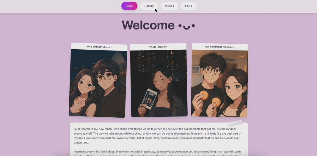 Traditional e-cards are one-liners and basic, but a Remerie feels alive. Instead of a plain message, you’re creating an interactive experience where every click reveals something sweet and personal. Everything is completely customisable and themed so you can make every Remerie truly your own. Pour your heart out for your special someone and create something that'll speak to them!